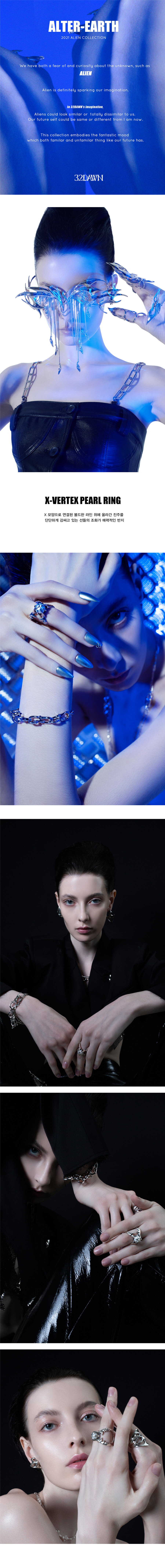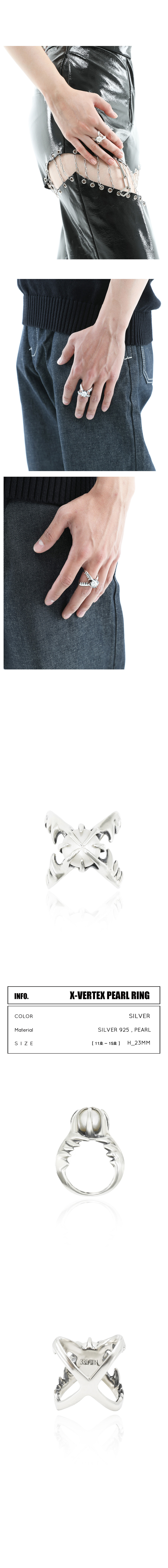 X 모양으로 연결된 볼드한 라인 위에 올라간 진주를 단단하게 감싸고 있는 선들의 조화가 매력적인 반지