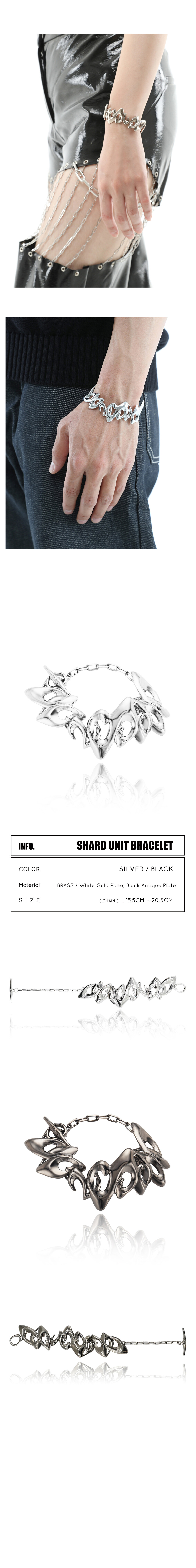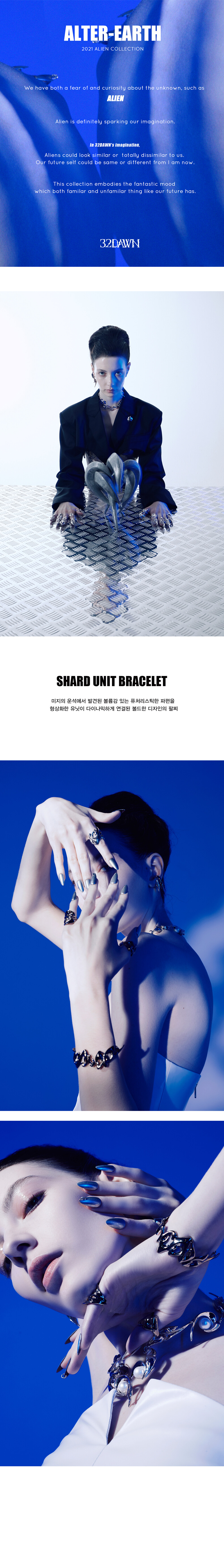 미지의 운석에서 발견된 볼륨감 있는 퓨처리스틱한 파편을 형상화한 유닛이 다이나믹하게 연결된 볼드한 디자인의 팔찌